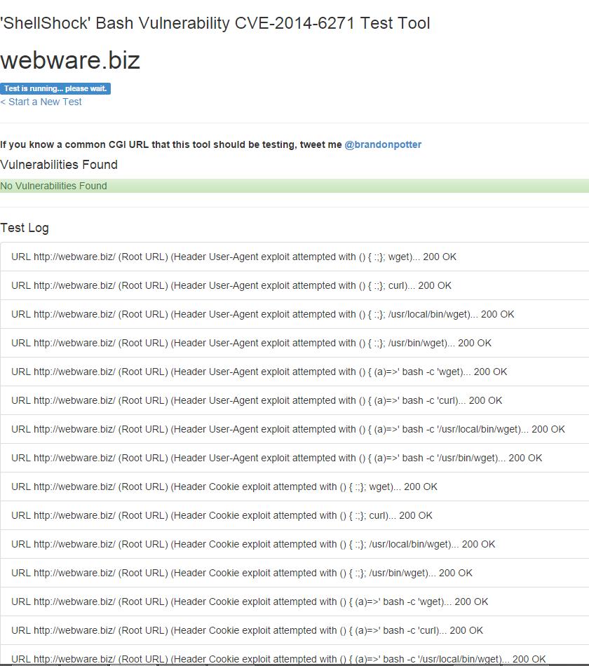 Для проверки уязвимости любого сайта (хостинга) можно воспользоваться онлайн утилитой ShellShock Bash Vulnerability.