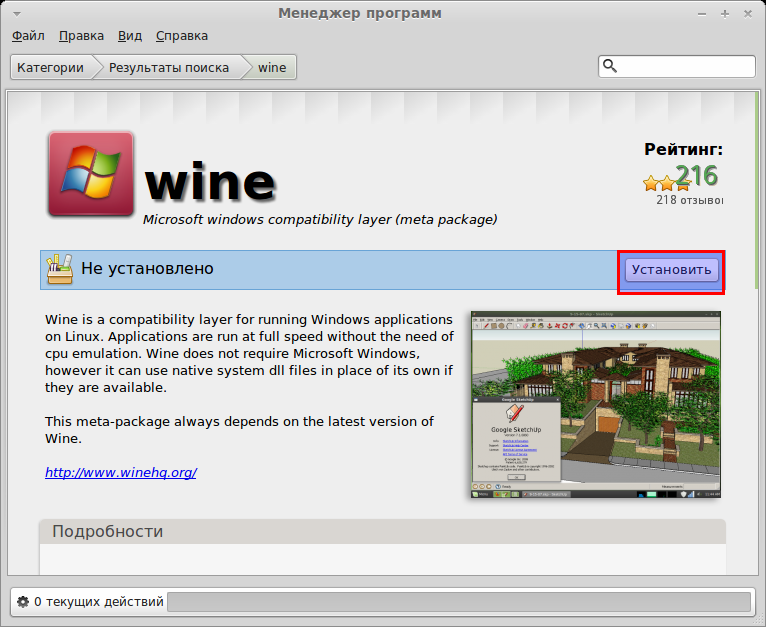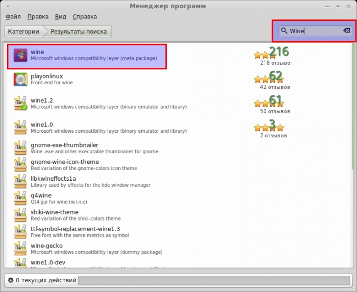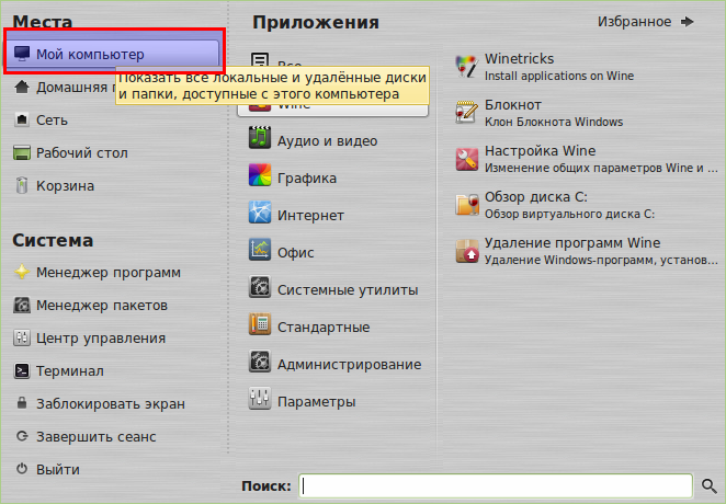 1. Установка необходимых программ. Необходимая программа, на самом деле, одна — Wine, но для удобства установим ещё Krusader — это двухоконный файловый менеджер, наподобие Total Commander (лично я, без этих программ, чувствую себя как без рук). Я не любитель консольных команд, поэтому нужные нам программы будем устанавливать через «Менеджер программ» с графической оболочкой. Здесь всё просто, открываем этот менеджер и вводим в окно «Поиск» «Wine» (ясное дело, без кавычек). Выбираем первый результат в списке поиска:
