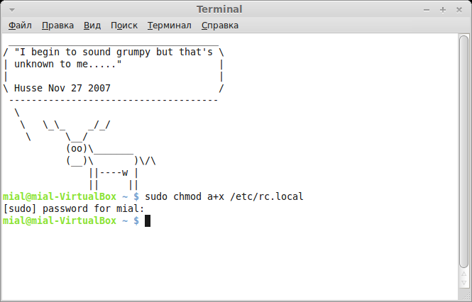 8. Добавление драйвера conslin в автозагрузку. В терминале набираем команду sudo chmod a+x /etc/rc.local