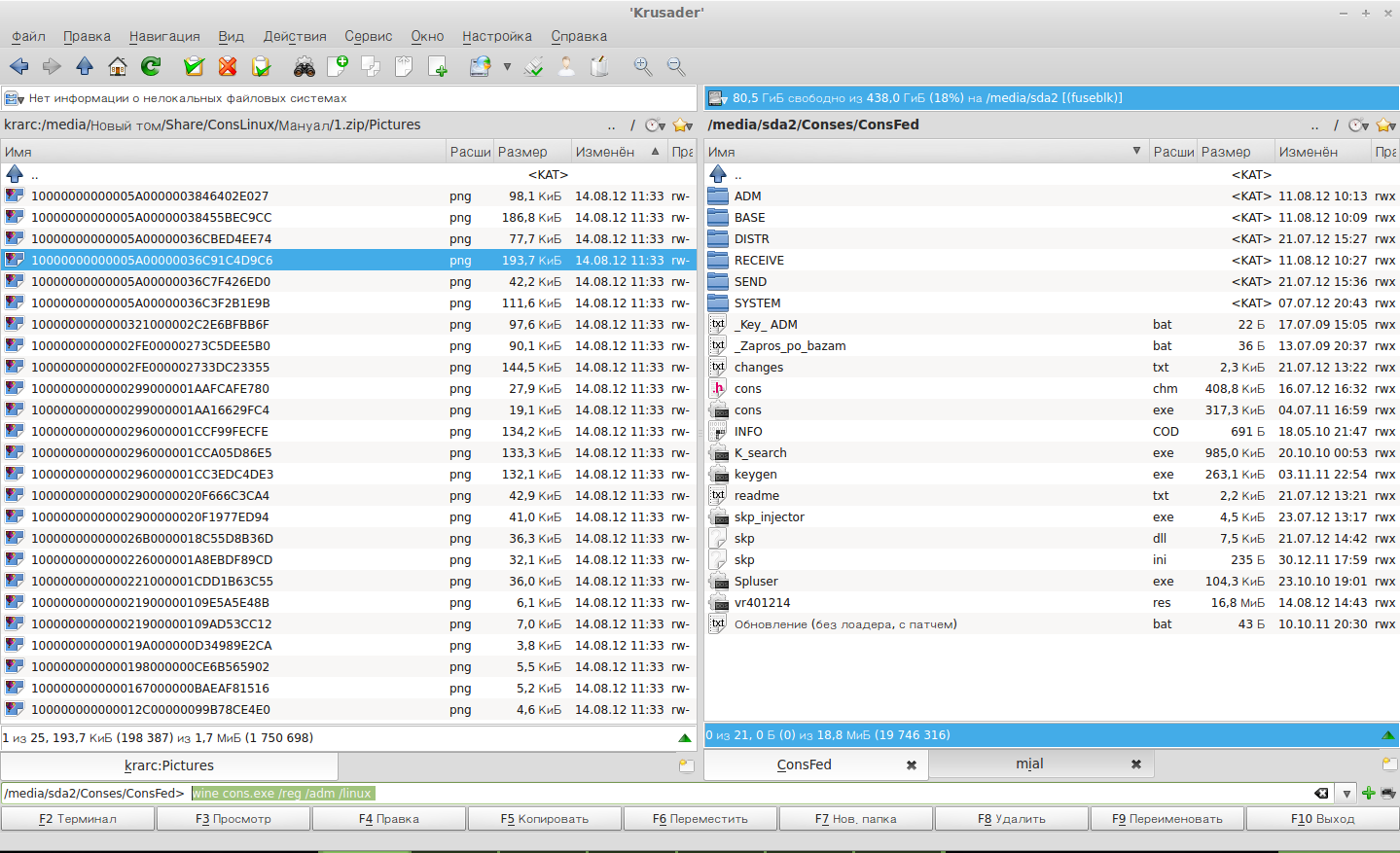 2) В Krusader переходим в папку с установленным консультантом. Почти в самом низу находим там поле для ввода команд и набираем там