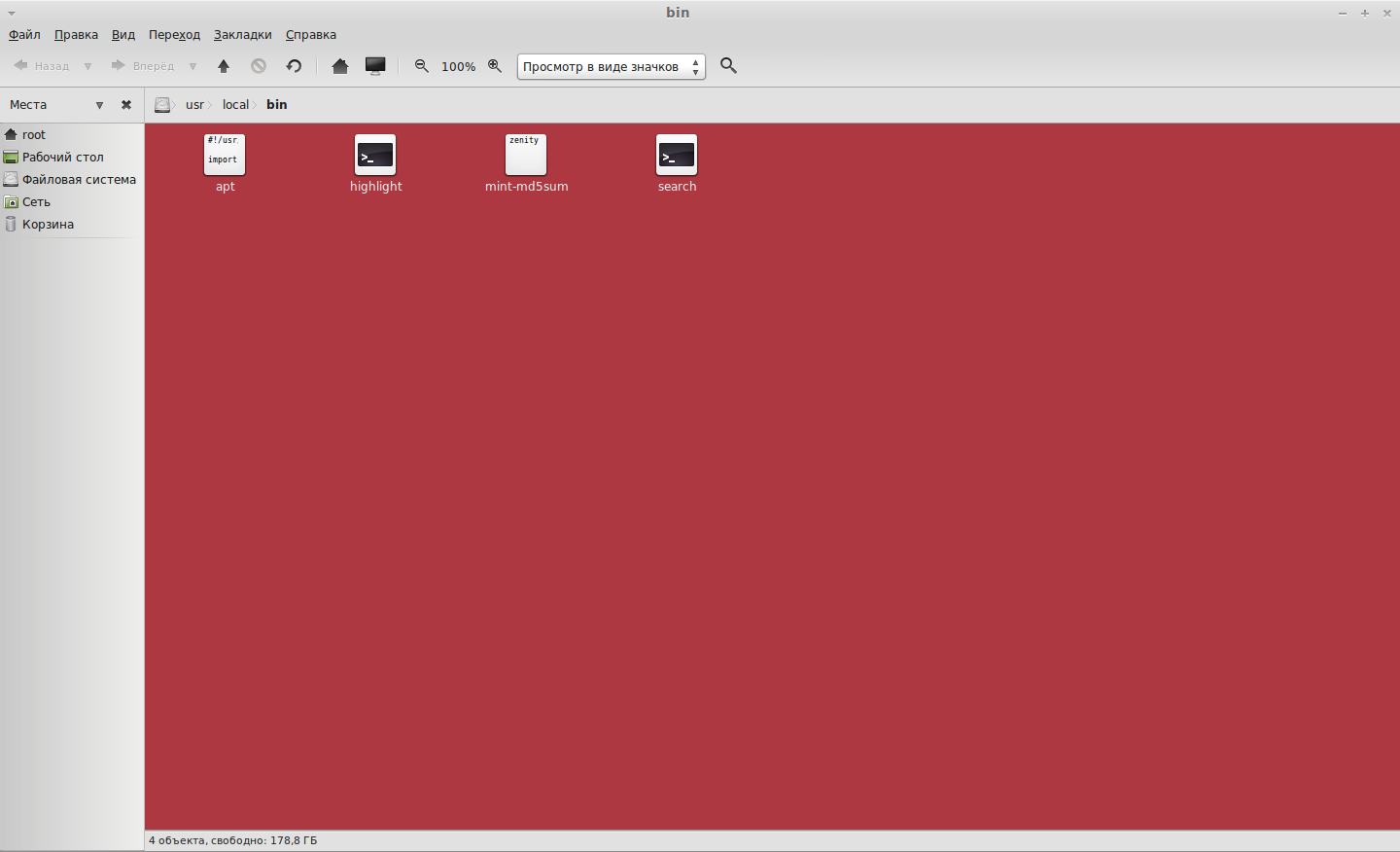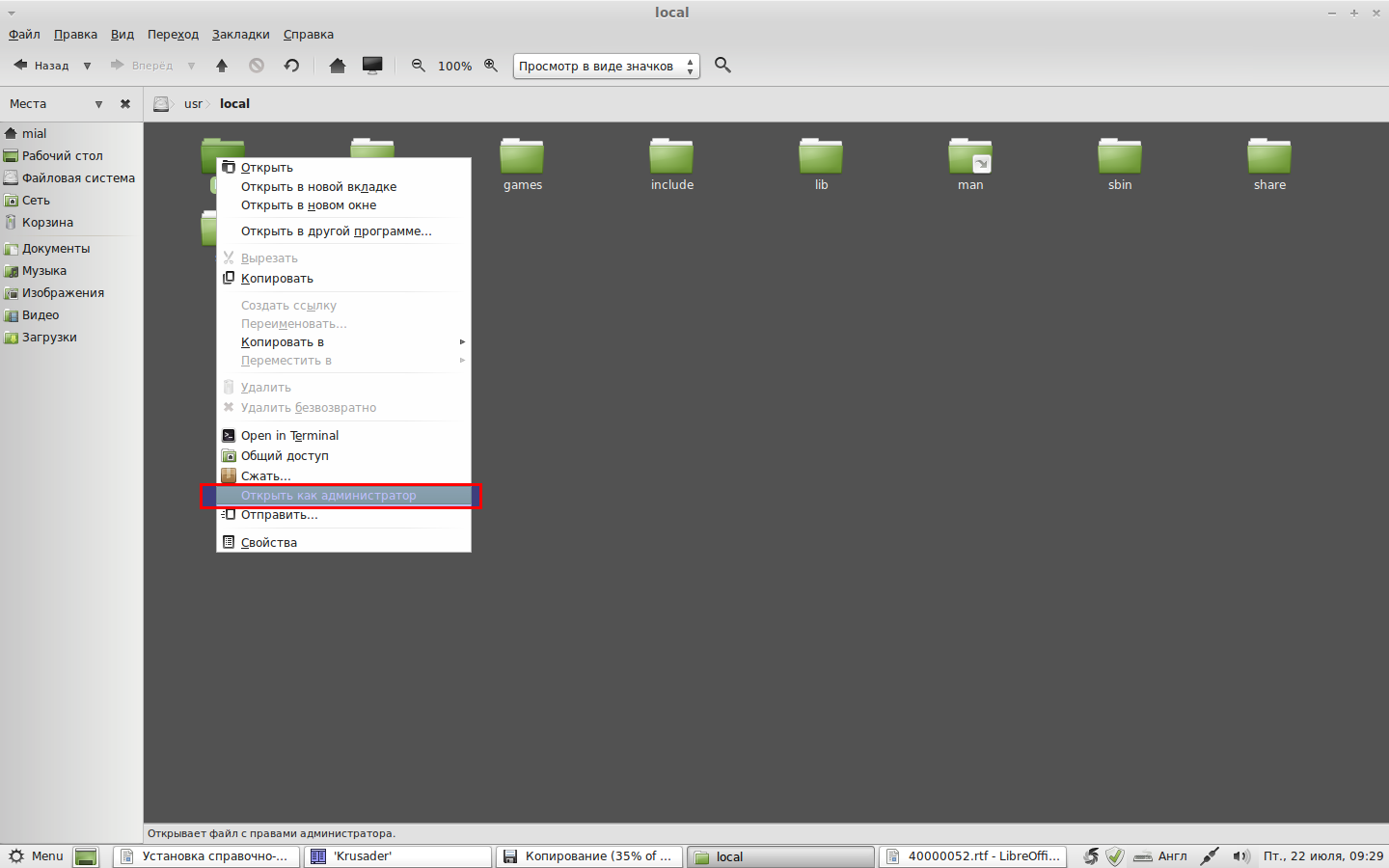 Переходим к файловой системе в папку /usr/local, кликаем правой кнопкой мыши по папке bin и выбираем там «Открыть как администратор»: