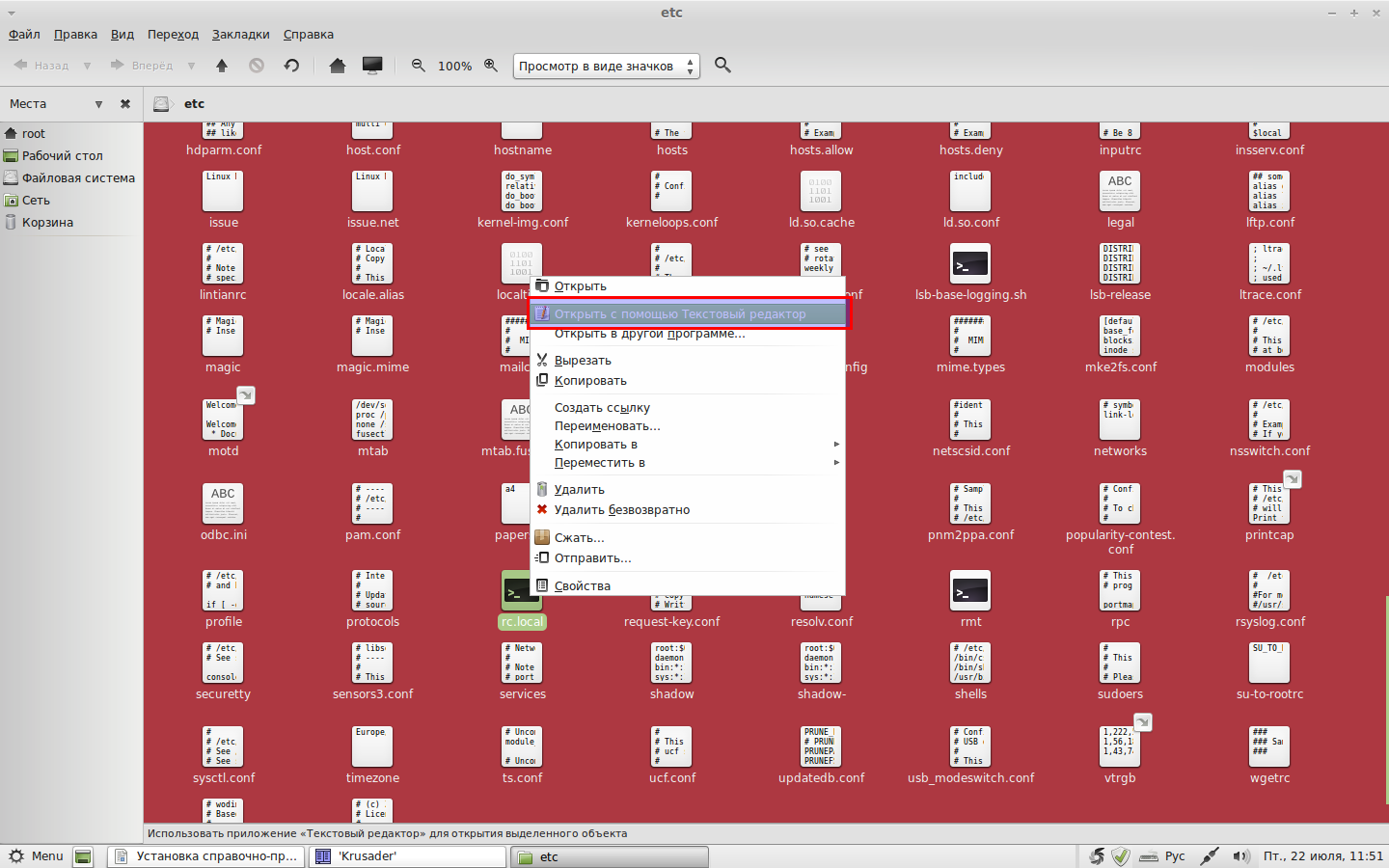 В стандартном проводнике (с правами администратора) переходим в каталог /etc, находим там файл rc.local и открываем его любым текстовым редактором:
