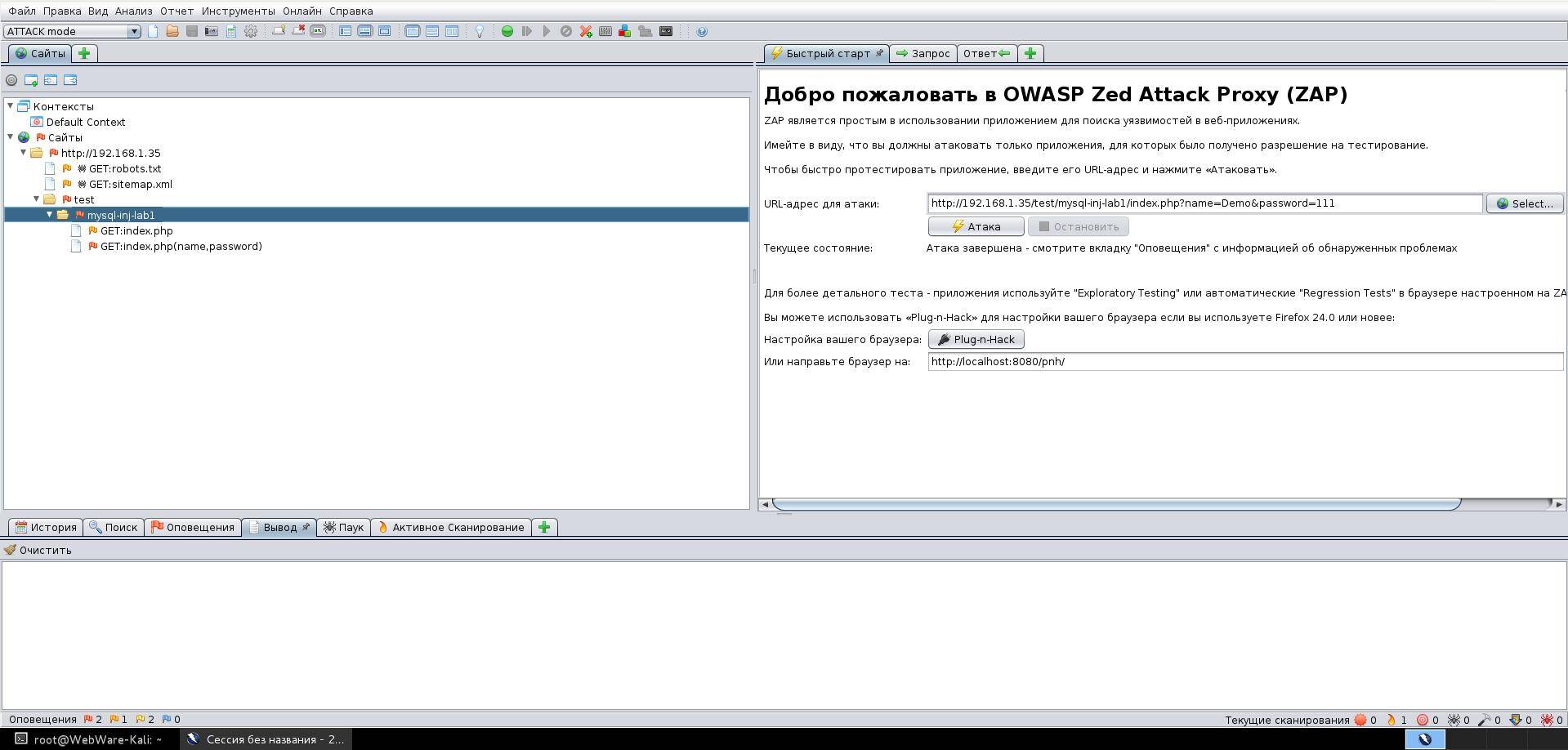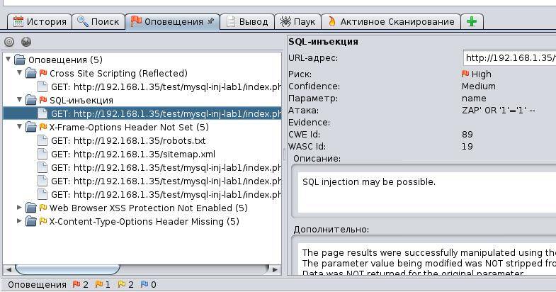 Для просмотра всех найденных уязвимостей и замечаний по безопасности, перейдите во вкладку "Оповещения":