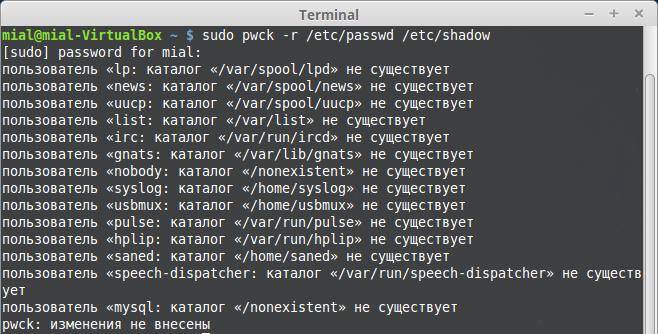Дистрибутивы Linux обычно содержат утилиту pwck. Эта маленькая утилита проверет согласованность обоих файлов и укажет на какие-либо проблемы. Задавая ключ -r мы определяем, что она работает в только режиме чтения.