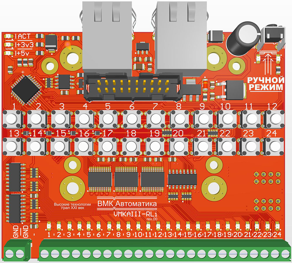 Может управлять 24 внешними реле. Также имеются специальные платы, которые могут размещаться под основной, на каждой такой плате распаяно по 6 реле. Итого можно собрать «стопку» из 3 плат – управляющей верхней и двух снизу. Платы скрепляются вместе с помощью игольчатых разъёмов.
