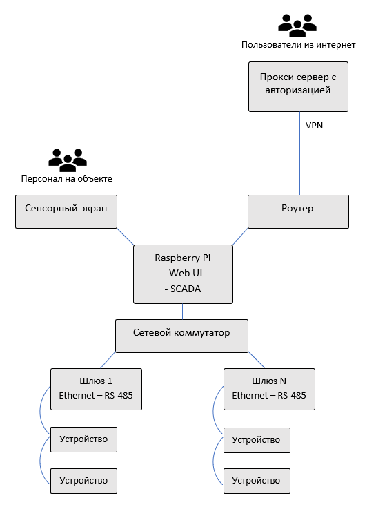 На объектах, где нет необходимости в автоматическом управлении оборудованием и не требуется высокая надёжность, и для сокращения стоимости внедрения системы, на объекте можно разместить только роутер, шлюз Ethernet – RS-485 и необходимые устройства на шине. SCADA система может размещаться на нашем сервере «в облаке», к системе можно подключиться через интернет с любого устройства. Например, так мы поступаем при диспетчеризации котельных.