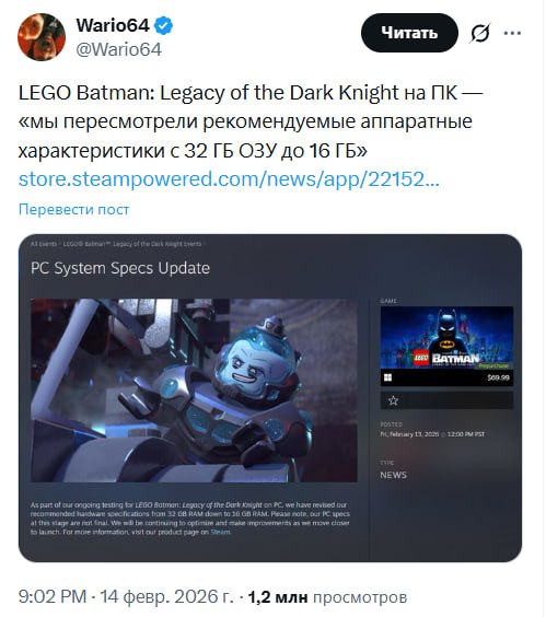 Игровые студии начали оптимизировать игры, чтобы победить кризис ОЗУ, например, они урезают системные требования и уже просят 16 ГБ вместо 32 ГБ. Так сделали авторы LEGO Batman: Legacy of the Dark Knight. Они обновили рекомендуемые характеристики для ПК и оптимизировали игру, потому что сейчас многие геймеры просто не могут обновиться.
