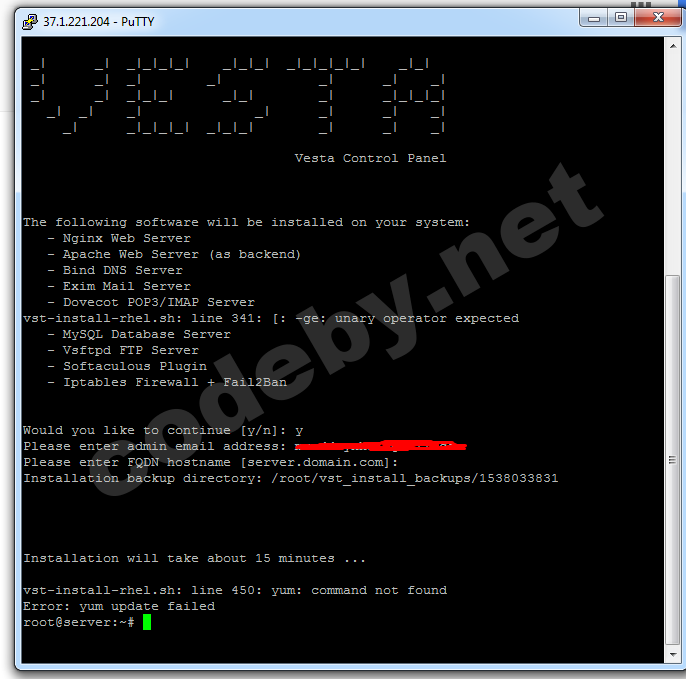 я НИГДЕ не прописываю yum! Действия которые проделал до того что, на скрине: curl -O http://vestacp.com/pub/vst-install.sh , bash vst-install.sh .