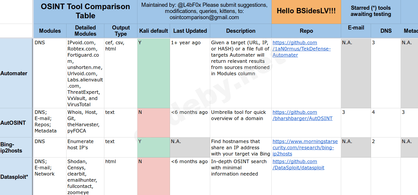 Таблица (OSINT Tool Comparison Table) вмещает в себе 25 популярных приложений, например: Parsero, DNSRecon, Automater. О каждом приложении есть детальная информация: ссылка на репозиторий, последние обновления, описание, с чем работает приложение и так далее: