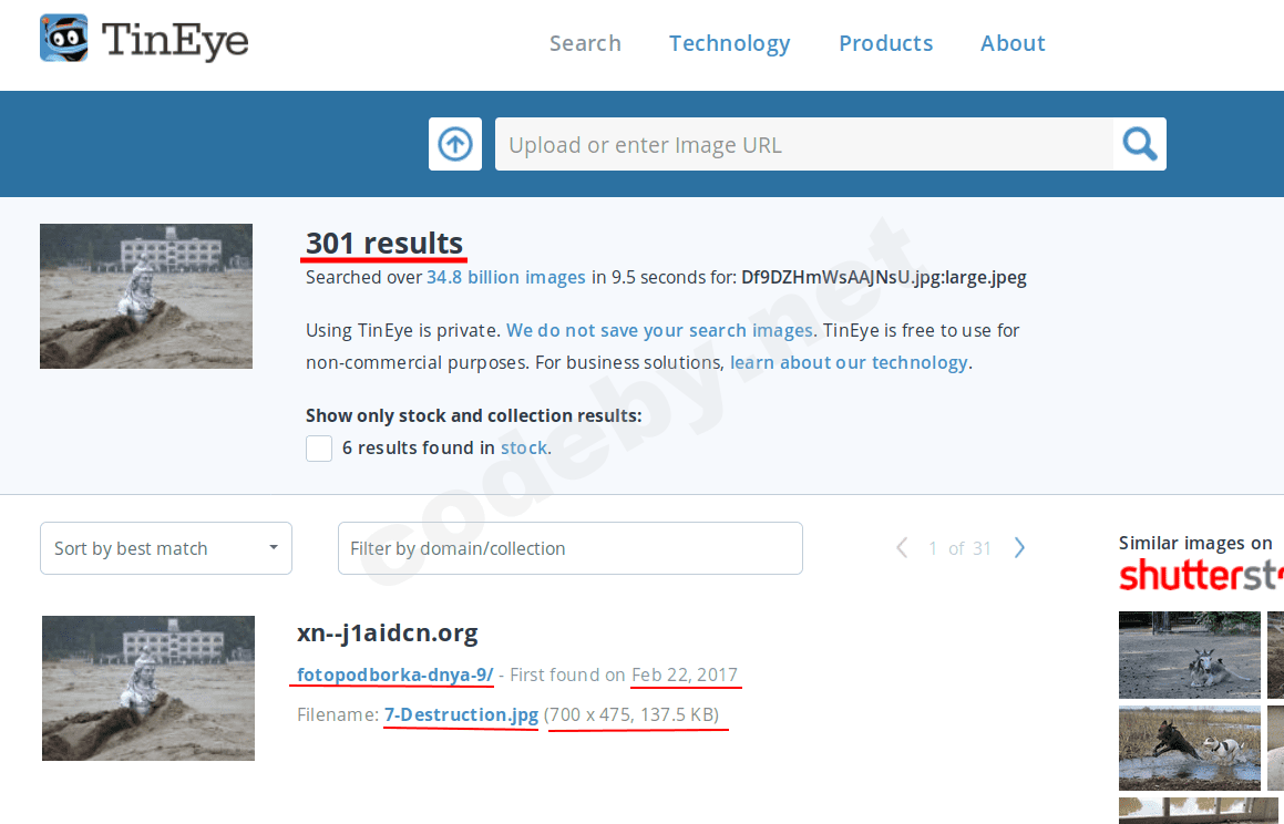https://www.tineye.com предоставляет бесплатные услуги поиска фотографии через весь интернет. Разработчики утверждают, что поиск происходит через 34,8 миллиардов фотографий. Удобен этот сайт тем, что при выводе информации о запрашиваемой фотографии, появляется самое необходимое: размер, дата загрузки, страница сайта, который имеет эту картинку, название и разрешение.