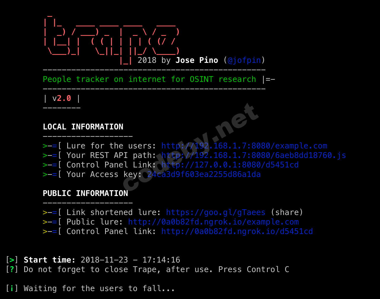 trape (jofpin/trape) - open-source инструмент, позволяющий отслеживать человека. Данный инструмент запрашивает ссылку-приманку, которая отслеживается в сгенерированной контрольной панели.