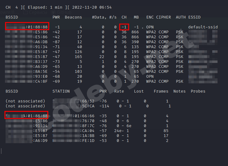 Доброго дня, хотел поиграться с точкой доступа своего дрона от Autel, запускаю airodump-ng на скан, вижу его скрытую точку доступа на -1 канале