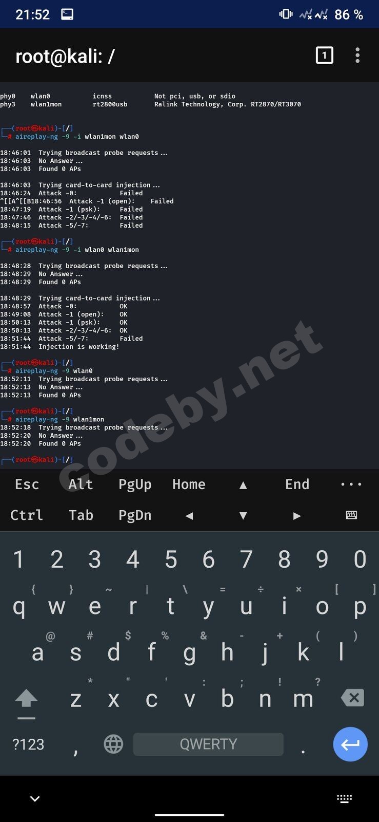 Здравствуйте, настроил wifi адаптер, перевёл в режим монитора, но инжекции проводить он не хочет. В вики написано, что поддерживаются инъекции. Что не так делаю?