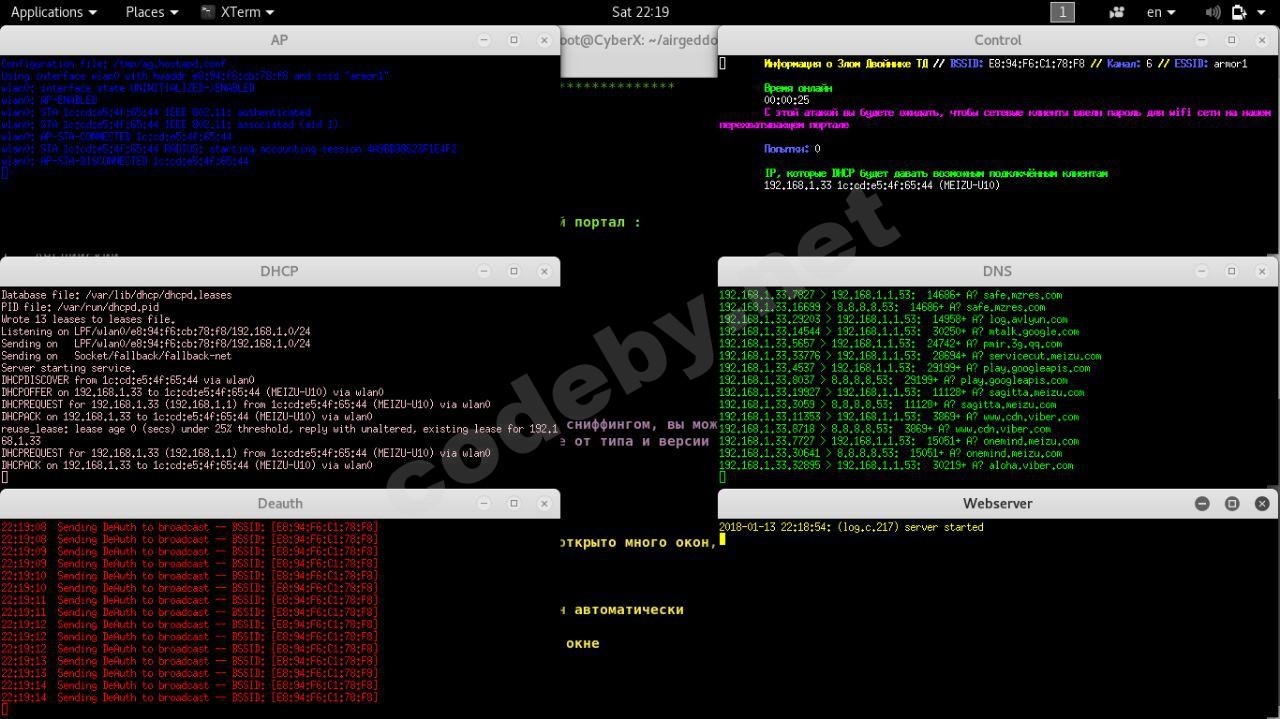 Имеет много функций,но рассмотрим лишь "9. Атака Злой Двойник ТД с перехватывающим порталом". Опишу функцию, создаётся поддельная точка доступа с таким же названием как у жертвы,в то же время происходит DoS точки доступа,из-за чего к ней не могу подключаться клиент и пытаются решаить проблему подключаясь к вашей фишинговой ТД где их встречает страничка на которой просят пароль под предлогом обновления драйверов роутера.