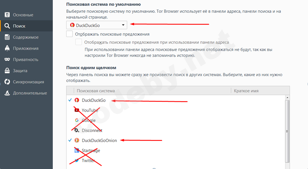 Дальше переходим во вкладку «Поиск» и там поисковой системой по умолчанию выбираем «duckduckgo.com» это поисковая система, в отличии от «google» и других, собирает о нас на много меньше информации, но при этом к сожалению является хуже того же «google» - но это всё мелочи. И ниже убираем все галочки с других поисковых систем, оставляем только «duckduckgo»