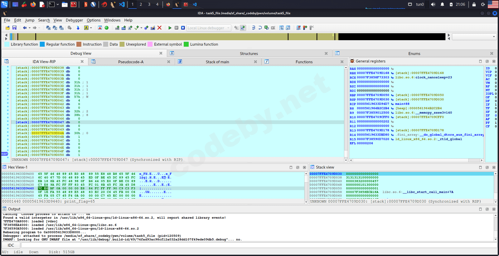 Вы не однократно видели, что у меня в exploit.py есть ветки с EDB и GDB (я еще доустанавливал pwndbg), но там я пока не разобрался, но придумал маленький костыль. В exploit.py я поставил запрос ответа пользователя, что бы успеть подключиться в IDA к запущенному процессу, что бы можно было посмотреть что в память легло. Спустя n-ое время и огромное количество проб получил таки нагрузку.