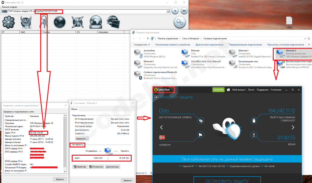1. В intercepter выбираю режим "сетевое подключение" (адаптер cyberghost TAP-Windows Adapter V9) .