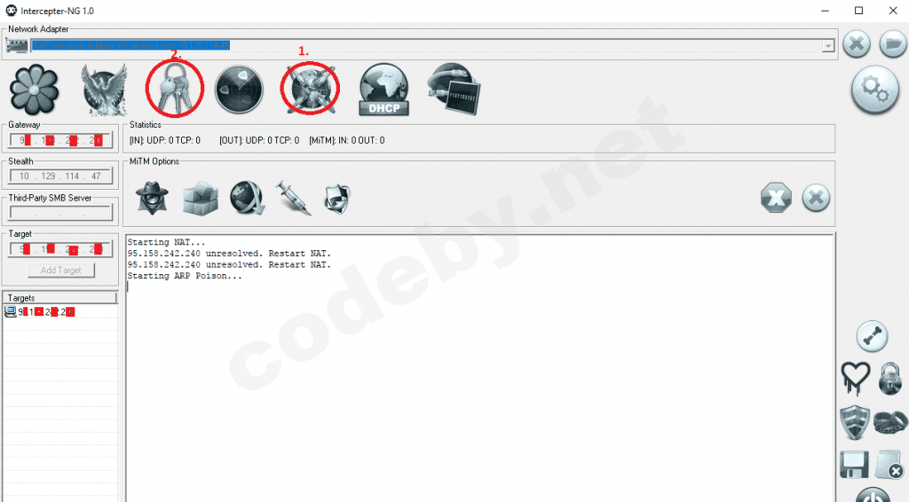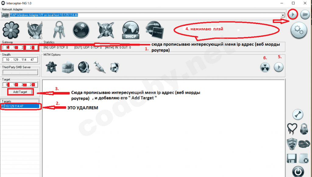 3. В раздел MiTM Mode удаляю машину (ip) в разделе Targets ,в Gateway прописываю интересующий меня айпишник веб морды роутера .Далее , в ручную прописываю(добавляю) ip веб морды роутера в Target и нажимаю Add Target .