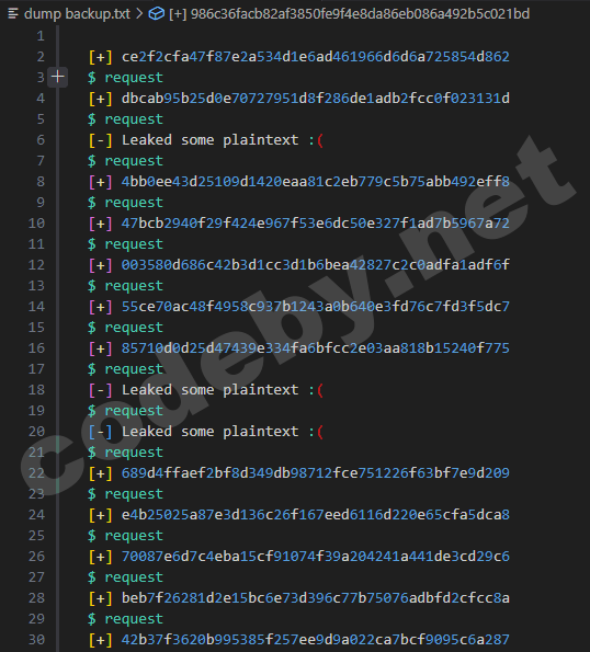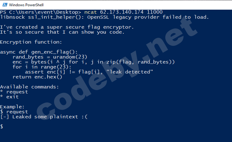 После XOR'ов всех символов флага программа проверяет на равенство каждый байт зашифрованного флага и изначального. Если таковой есть, то печатает "Leaked some plaintext".