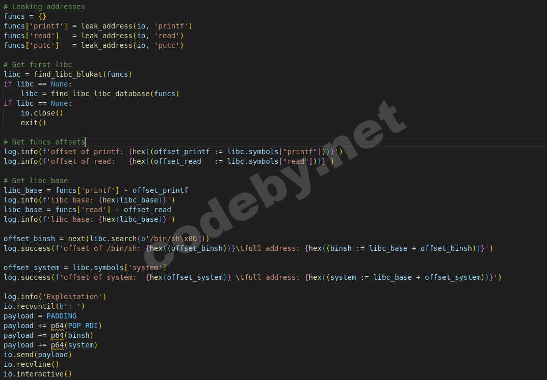 И две функции, которые получают возможные libc по ликнутым адресам, скачивают первую либу и подгружают ее, что бы иметь возможность искать прямо в либе оффсеты system и /bin/sh, ну и посчитать базу libc.