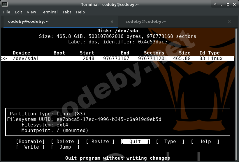 1. Загружаем CodebyOS в Live режиме, проверяем командой sudo fdisk -l имеющиеся диски, разделы и то, как они отображаются. После чего при помощи cfdisk создаём необходимые разделы на диске, куда будут заливаться данные. В примере и далее это раздел / (если стоит efi, то создаем еще один раздел на 100мб, fat32), на cвой HDD.