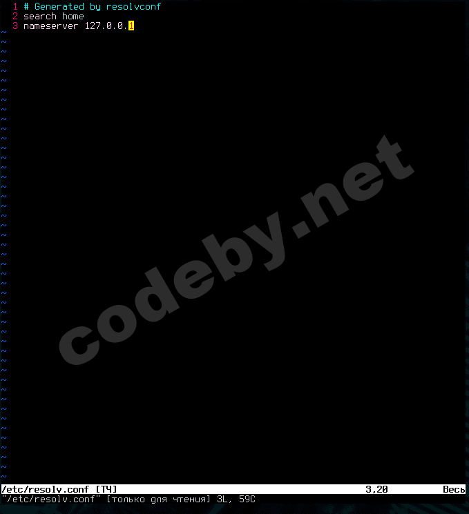 2. Далее редактируем файл /etc/resolv.conf меняем адрес nameserver на 127.0.0.1