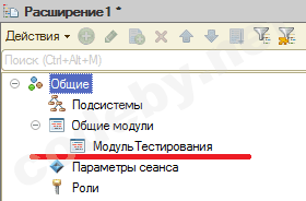 Расширение у нас есть осталось теперь написать код для проверки работоспособности идеи. Кликаем на расширение, перед нами открывается еще одно дерево метаданных выбираем в нем пункт "Открыть модуль управляемого приложения".