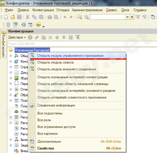 Логин и пароль у нас есть заходим в базу пункт меню конфигурация->Открыть конфигурацию. В нашем случае это Управление торговлей 11, правой кнопкой по названию, выбираем пункт "Открыть модуль управляемого приложения"