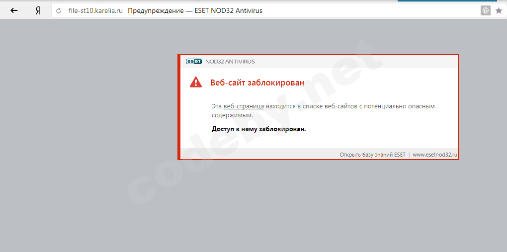 Вложение абсолютно не при делах! На скрине ясно видно, что блочится исключительно САЙТ. Он находится в списке нежелательно-посещаемых для NOD-a. Видимо он, как файлообменник, не раз "залетал" НОД-овцам и они сочли его "файлопомойкой".