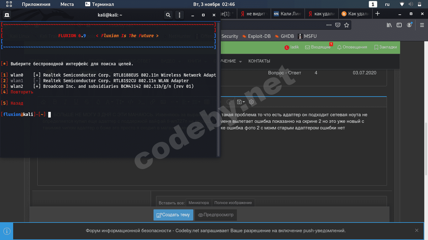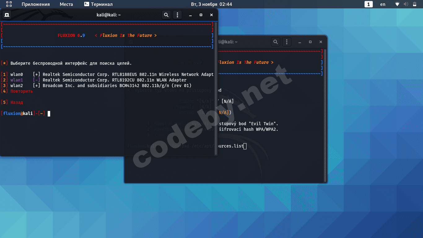 Не очень понял в чем проблема) Ибо часть вывода на испанском. Если твоя цель хакнуть wifi, то самый простой путь это перехватить handshake c помощью airodump-ng и кракнуть с hashcat. Fluxion такая себе прога( на нее никто не поведется ))). Да и покупать лишние адаптеры было лишним)). А если тебе хочется попробовать с ним, то нужен нормальный вывод ошибки( выбери англ яз при запуске скрипта).