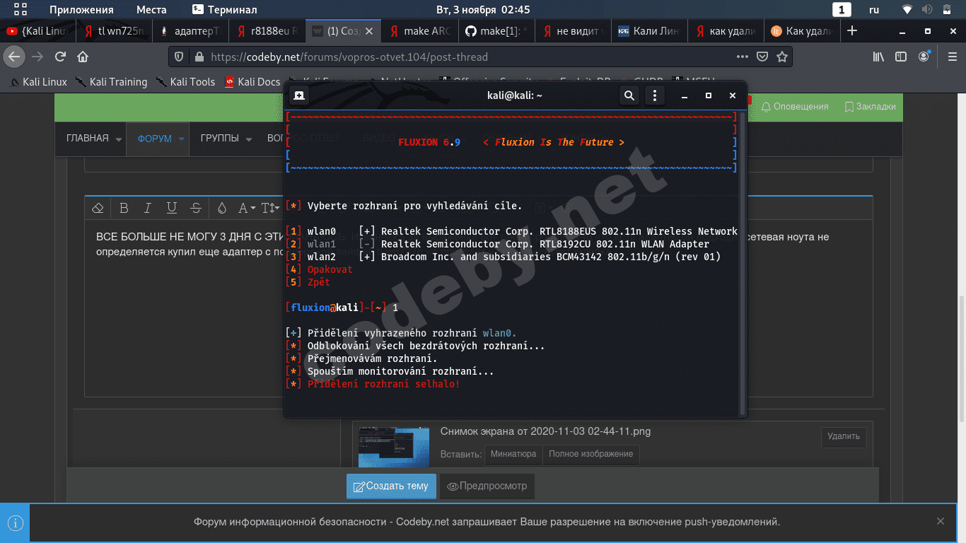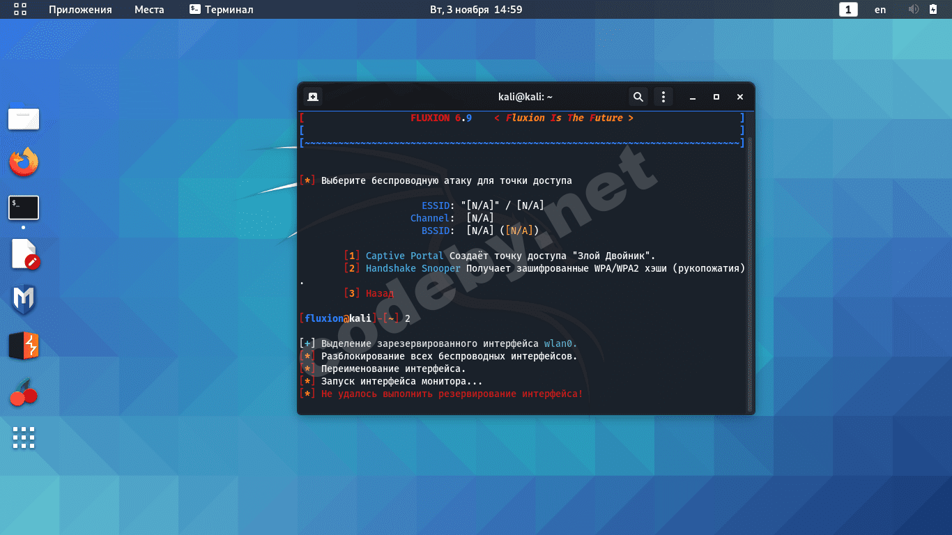 и ещё. очень мало информации. кали грузите с флешки, с виртуалки или установлена на хард? обновляли ли систему? попробуйте другие инструменты. например airgeddon или wifite