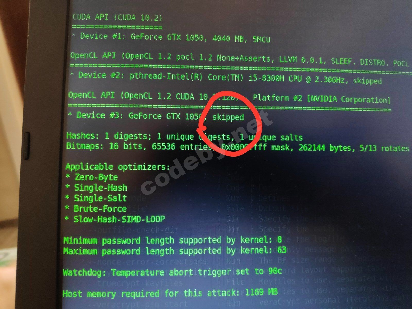 Я установил самые новые драйвера Nvidia(видно на фото ниже) и hashcat не нашел мою видеокарту(Geforce gtx1050).