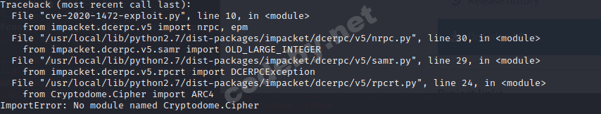 Попробуй вначале установить данный модуль через pip и только потом импортировать.Использую Kali linux когда я пытаюсь запустить CVE-2020-1472 выдает ошибку ImportError: No module named Cryptodome.Cipher ничего не помогает, может у кого есть решение?Посмотреть вложение 45743