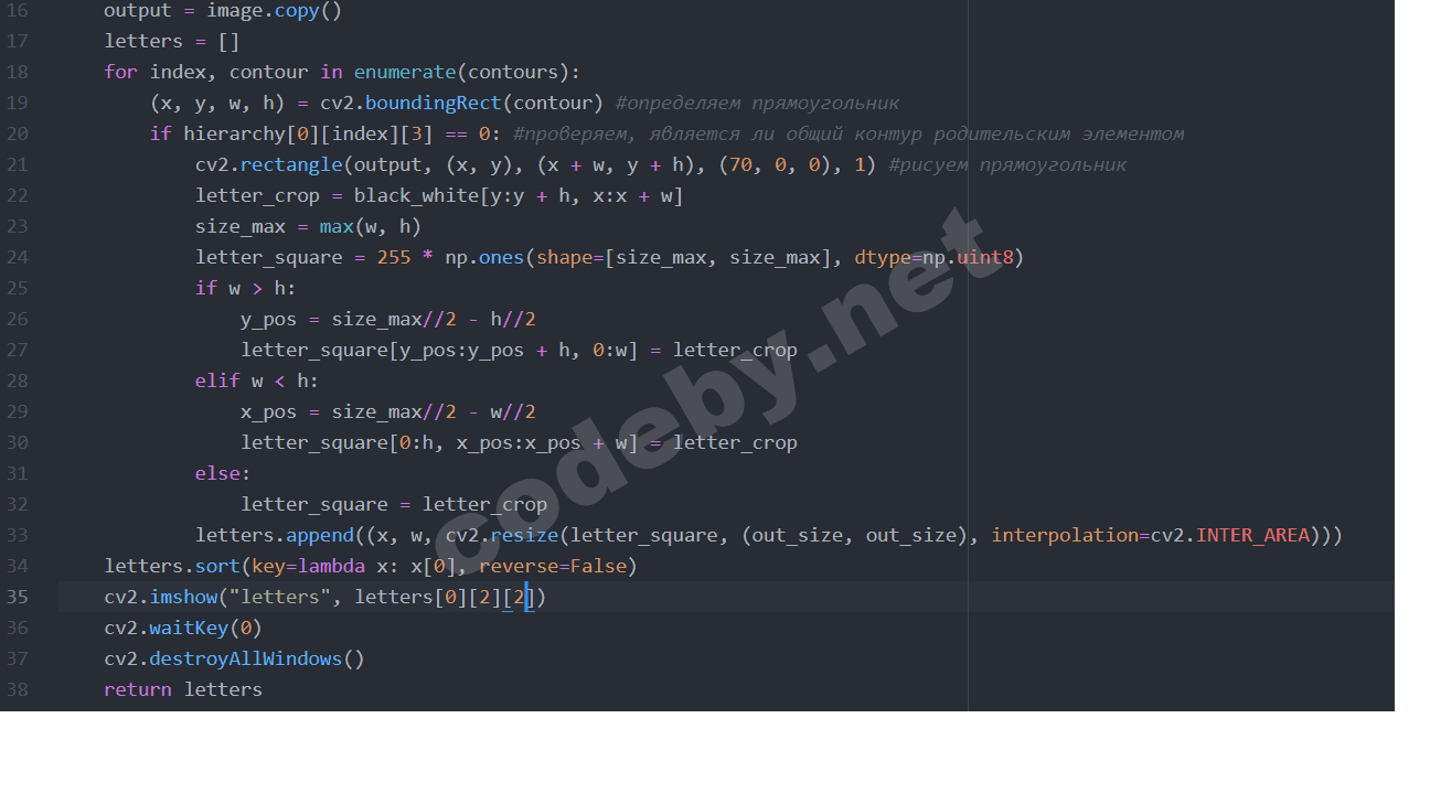Доброго времени суток читающим, хочу написать распознавалку текста на python при помощи OpenCV, контуры нахожу с помощью canny, после чего стоит задача извлечения каждого символа в отдельное изображение 28x28 (для удобной работы с MNIST); Я рисую прямоугольник вокруг каждого элемета, а затем складирую все буквы в список letters, но, тем не менее, проверяя результат и выводя какие-либо символы, получаю либо пустое окно, либо окно с точкой, либо окно со стрелочкой из нижнего левого угла изображения, но буквы вывести не получается;(