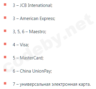 Банковский идентификатор, прежде всего, позволяет узнать вид используемой платежной системы. Согласно банковским стандартам, первая цифра считается указателем принадлежности к таким платежным системам: