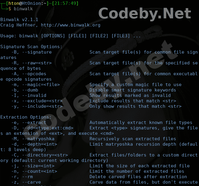 Этот инструмент используется при работе с бинарными образами, он имеет возможность находить встроенный файл и исполняемый код, исследуя файл образа. Это очень мощный инструмент для тех, кто знает, что они делают, его можно использовать для поиска конфиденциальной информации которая может быть использована для обнаружения взлома.