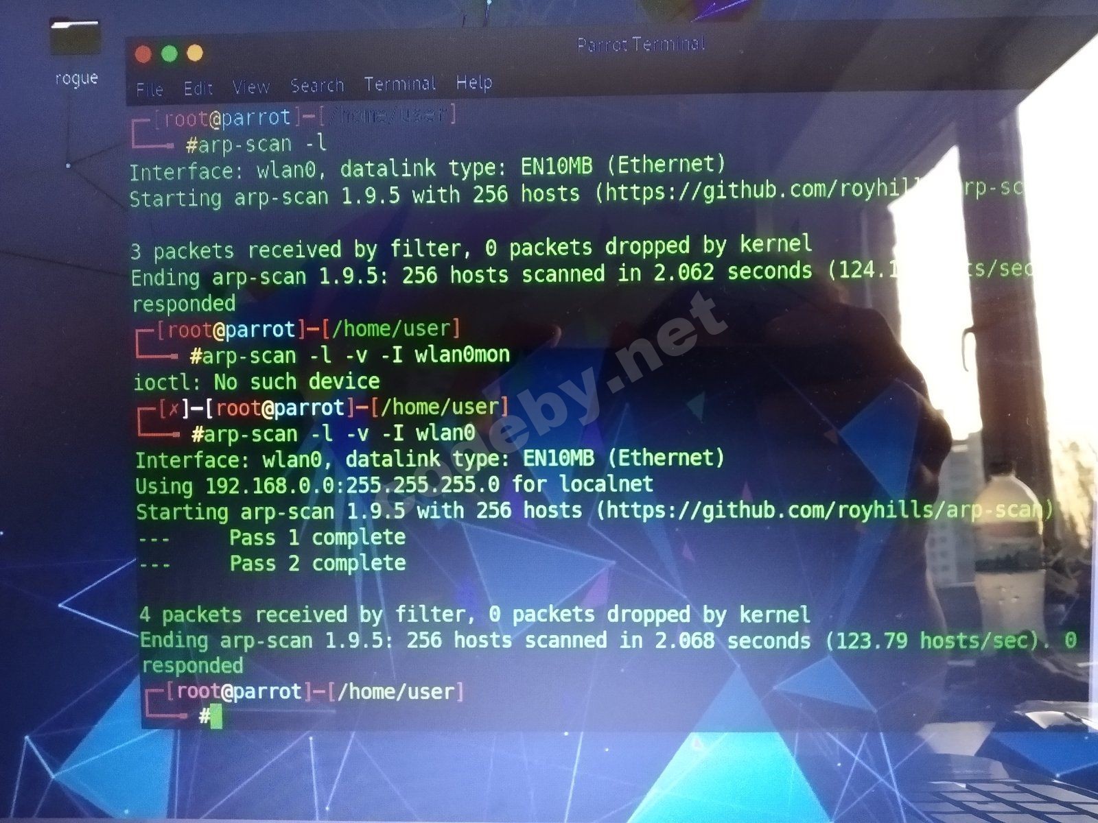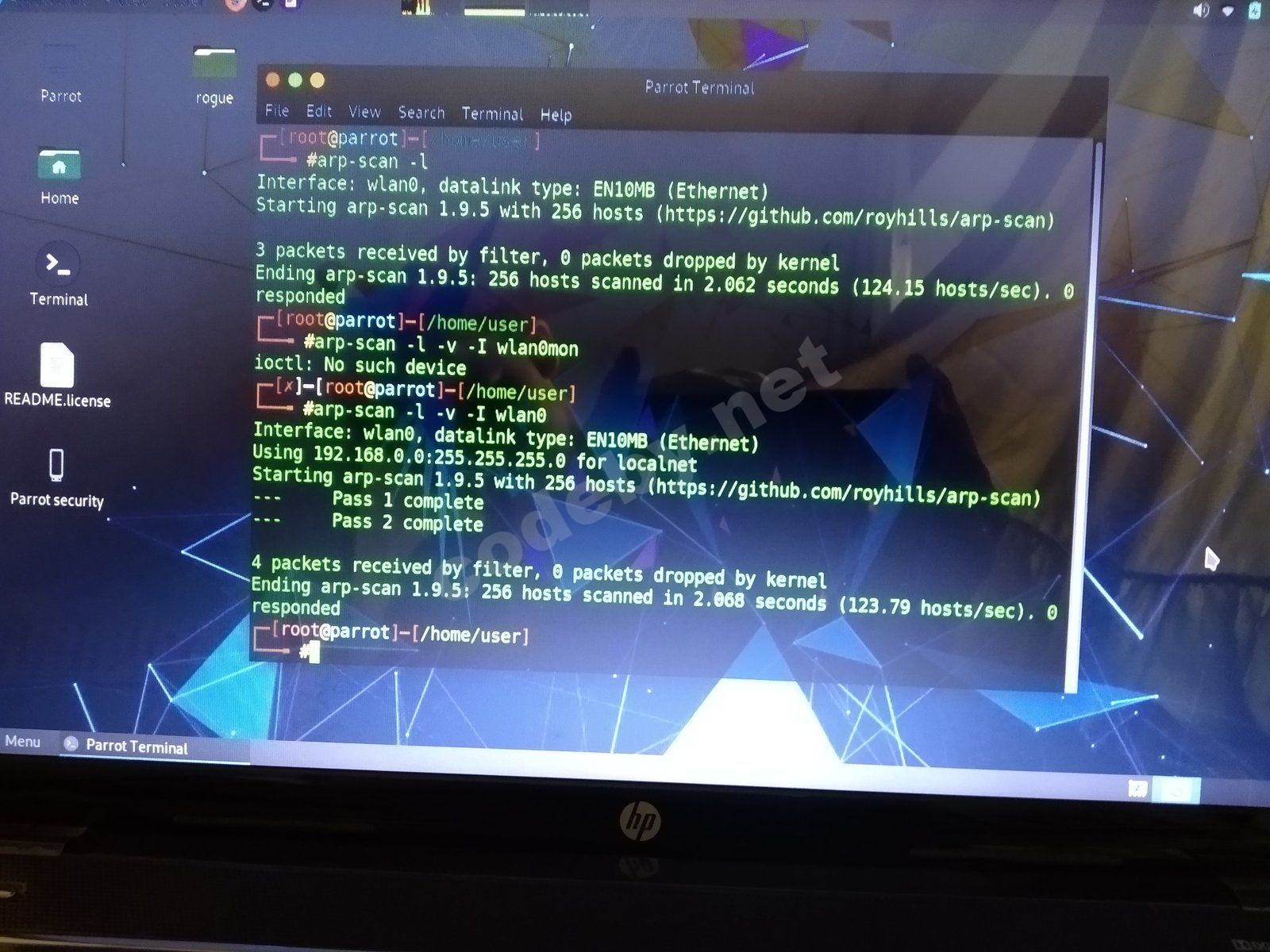 nmap -F 912.168.1.0/24apt-get install netdiscovernetdiscover -i wlan0 -r 192.168.1.0/24Сейчас специально установил c github'aПривет да я не знаю что уже делать parrot security os вместо кали поставил всё работало но после обновления перестало