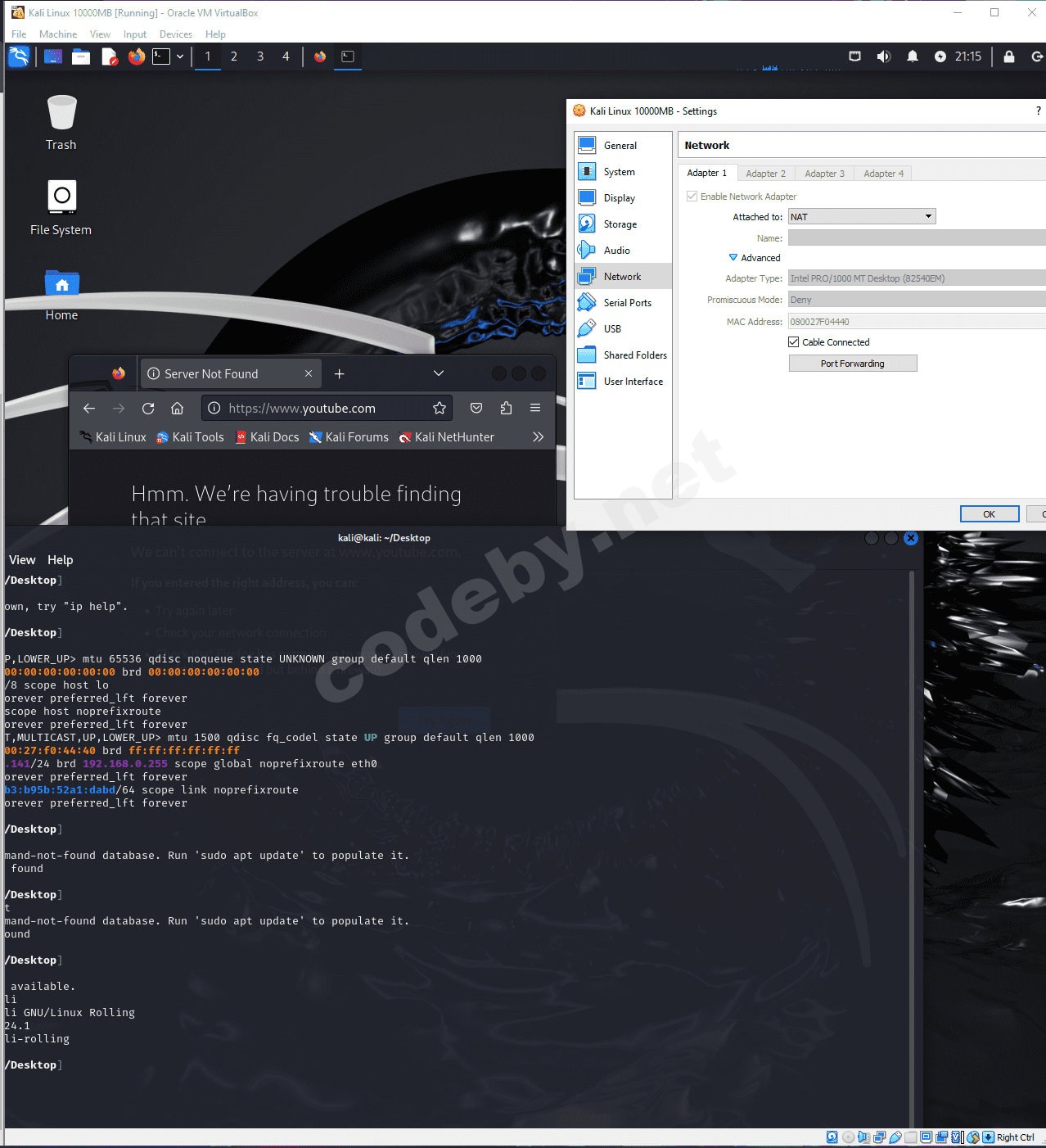 Проблема следующая. На виртуальной машине c OC KaliLinux возникла проблема. Нет подключения к интернету... Его просто нет. Я перепробовал за сегодня все типы подключения и перелазил все форумы...