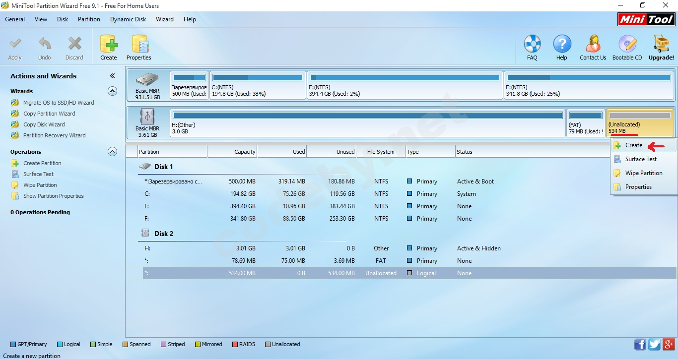 Щелкните правой кнопкой мыши на нераспределенное место на флешке и кликните Create, жмите OK.