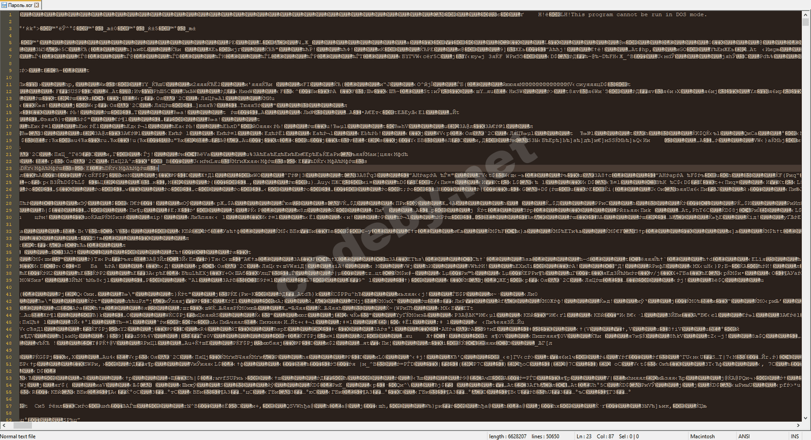 Открываем как текстовый файл через NotePad++ и встречаем стену из неправильной кодировки. Пытаемся поменять кодировку через сам редактор - предлагаемые ANSI, UTF-8, UCS-2 не меняют эту стену на читаемый текст, хотя английские предложения и слова в этой стене встречаются, например, в первой строке.