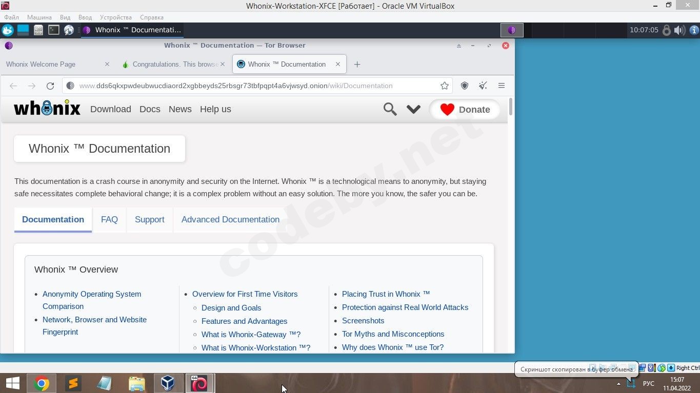 Всем снова привет народ. Столкнулся с такой забавной вещью. Когда выполнил запуск gateway, появилось вот такое вот консольное окошко, хотя раньше его финальный вид был как на окне workstation в форме раб стола. Запустил workstation, запустил браузер. Ipchek показало вроде как удачное подключение к тор. Открыл рандомный сайт, например whonix doc. Из слов написанных в документации следует, что workstation работает либо через gateway либо не работает вообще. А gateway либо работает через тор, либо не работает вообще. И так как у меня загружаются сайты, то все по идее работает правильно ? Тогда почему у меня вместо раб стола на gateway только консоль ? Или это все нормально и так и должно быть ? Скриншот 11-04-2022 150701.jpg Скриншот 11-04-2022 150711.jpg