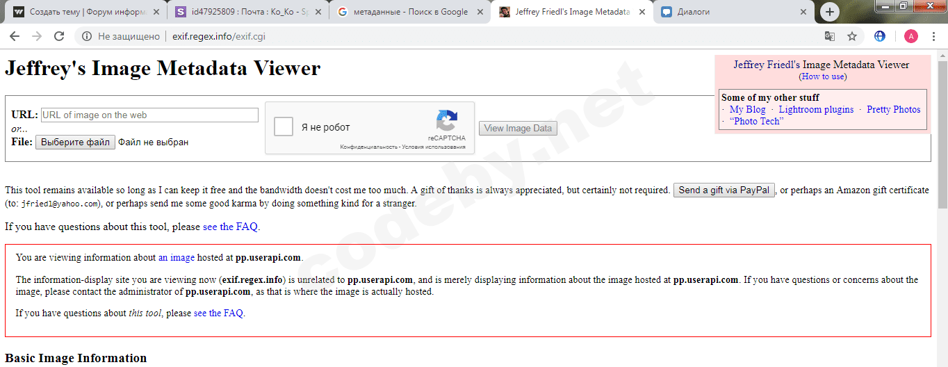 Перейдём от подобной болтовни к практике, исходя с плана для этого текста я обязан сейчас расписать о данных фотографий, не вижу смысла этот процесс оттягивать. Прямым моим сообщником и помощником станет интернет-ресурс под названием Jeffrey Friendls Image Metadata, ссылку на это творения свободной фантазии я оставлю в конце статьи.