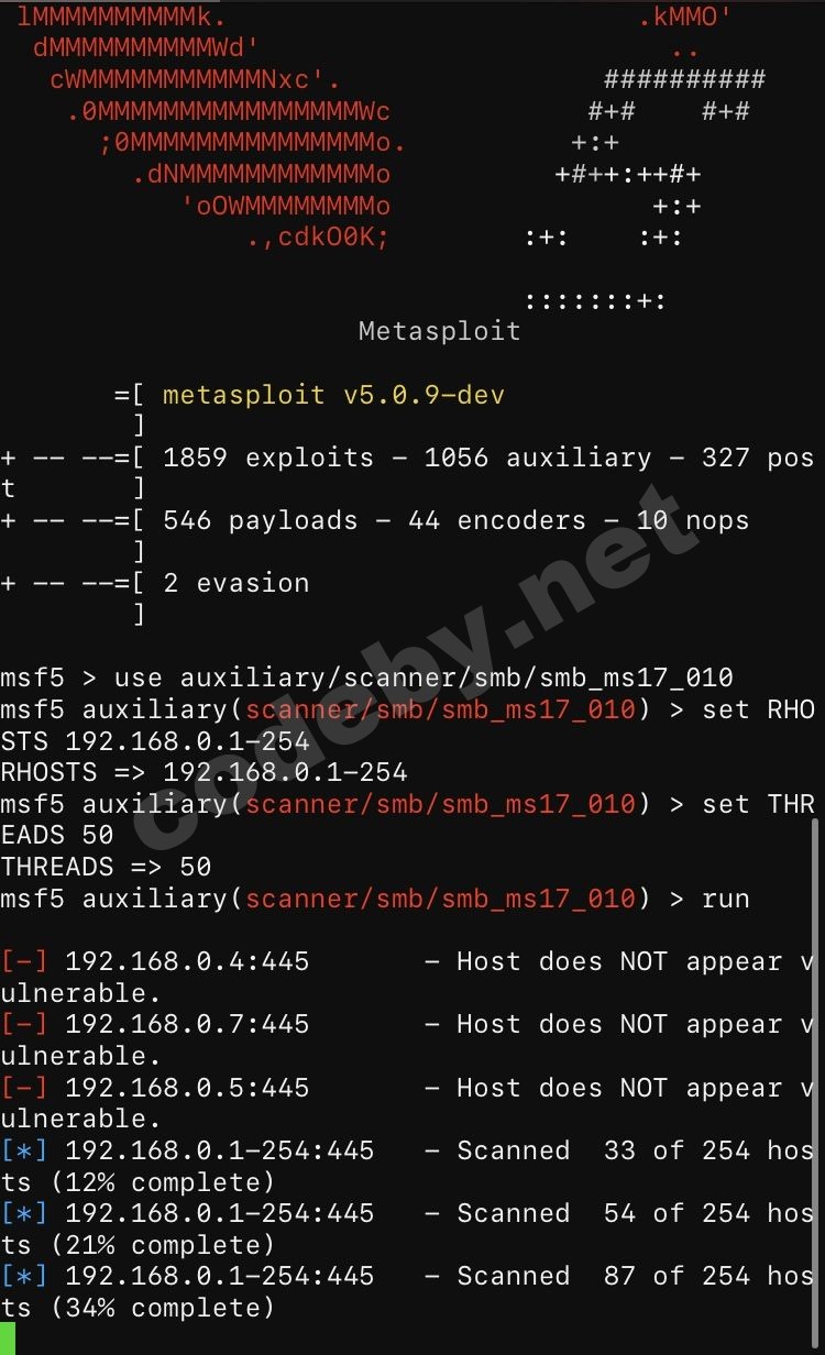 Привет всем,ошибка «Хост не выглядит уязвимым» с уязвимостью ms17_010 мучает меня уже около месяца,все было нормально,атаки проходили,но как только я заменил роутер с tp-link на mercusys пошли баги.Я сканировал сеть сперва с помощью сканера eternalblue, потом с nmap и даже с помощью стороннего инструмента.Сканер метаслоит говорит что хост не уязвим,nmap говорит что порт 445 открыт а тот инструмент пишет что 445 samba protocol открыт.