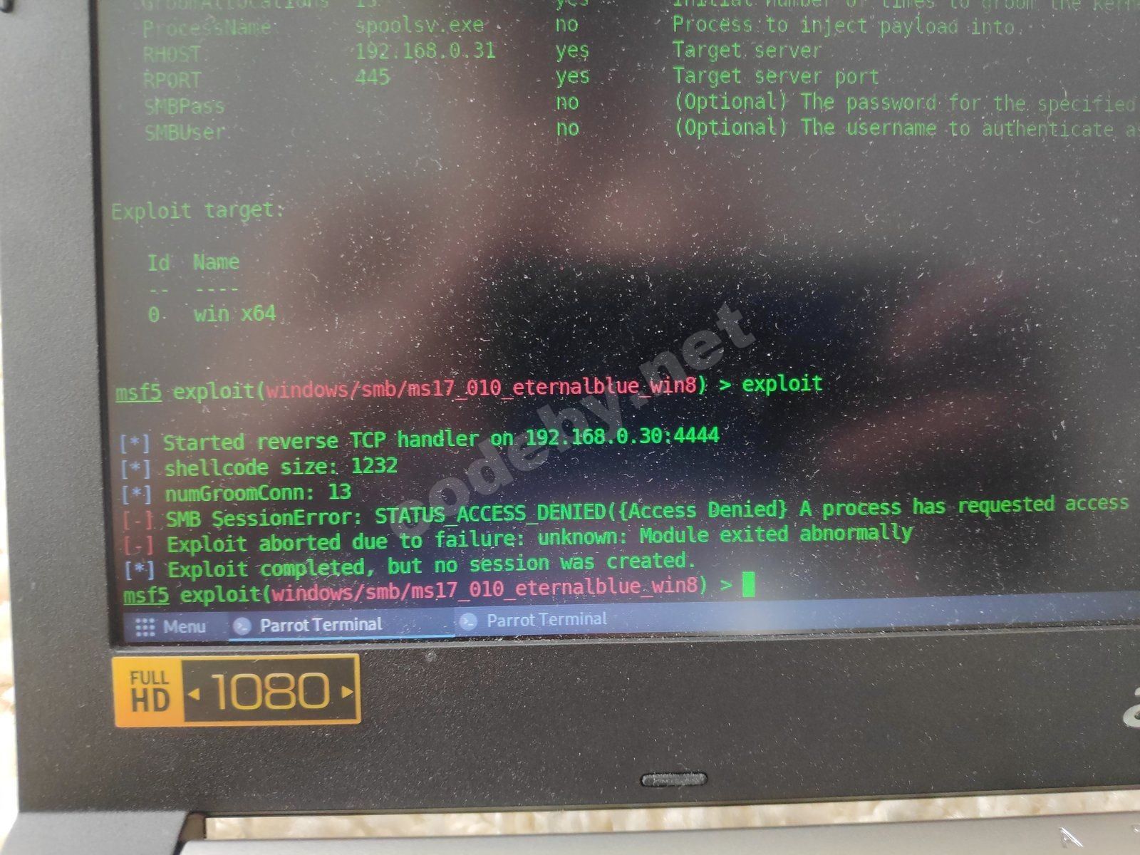 Здравствуйте я недавно познакомился с metasploit, и я попытался протестировать свою windows 8. Пытался "взламывать" я на дистрибутиве linux: Parrot os. И у меня не получилось. Кто может помочь, помогите пожалуйста. Вот фото. Заранее спасибо.