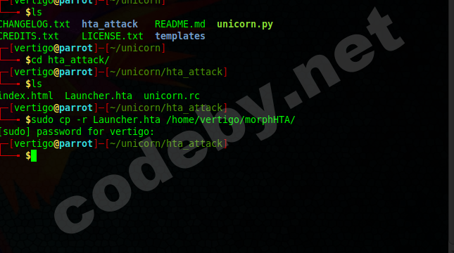 У него после генерирования нагрузки появляется директория hta_attack c файлами Index.html,Launcher.hta и unicorn.rc