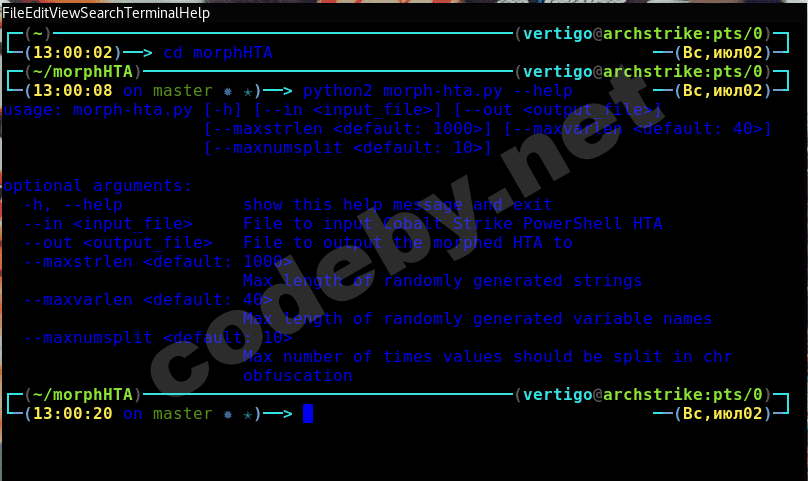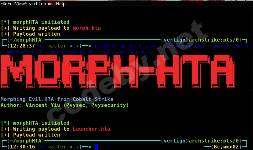 python2 morph-hta.py --in morph.hta --maxstrlen 4 --maxvarlen 4 --maxnumsplit 4 --out Launcher.hta