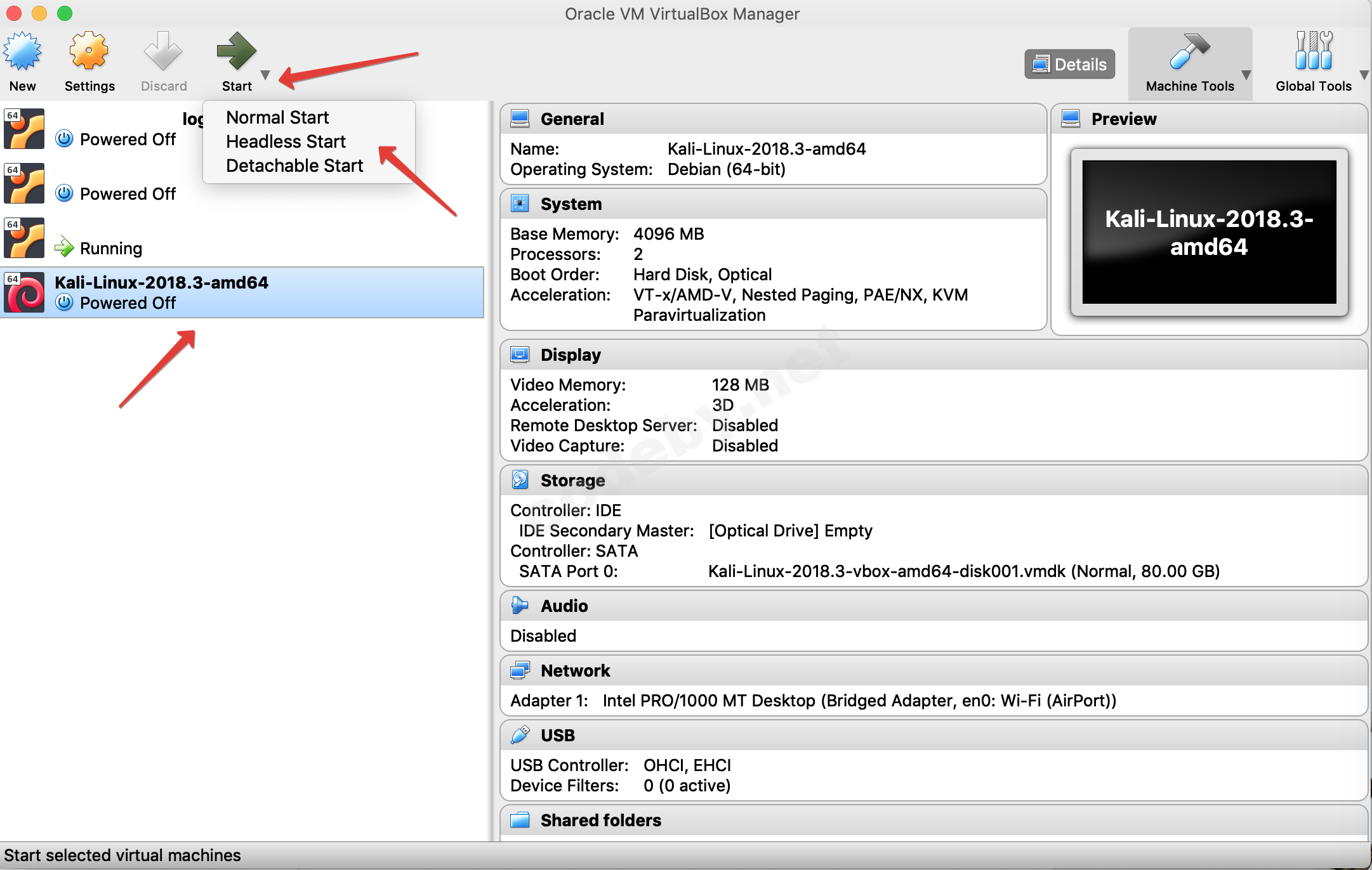 Открываем VirtualBox и запускаем Kali но не так как это делаем обычно а в фоновом режиме.