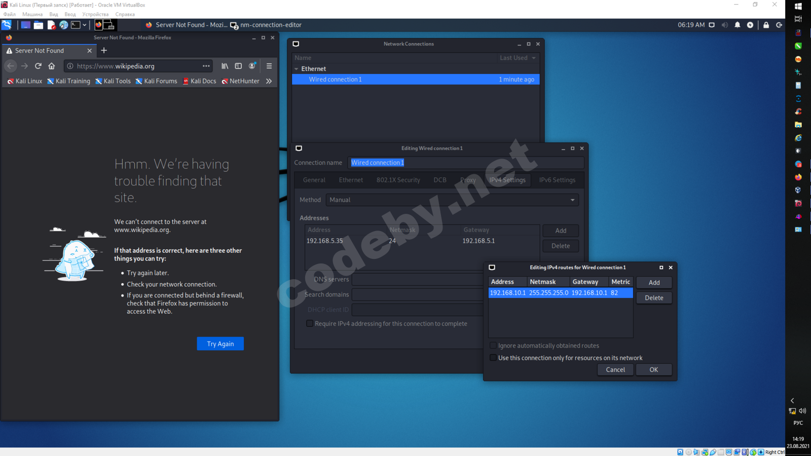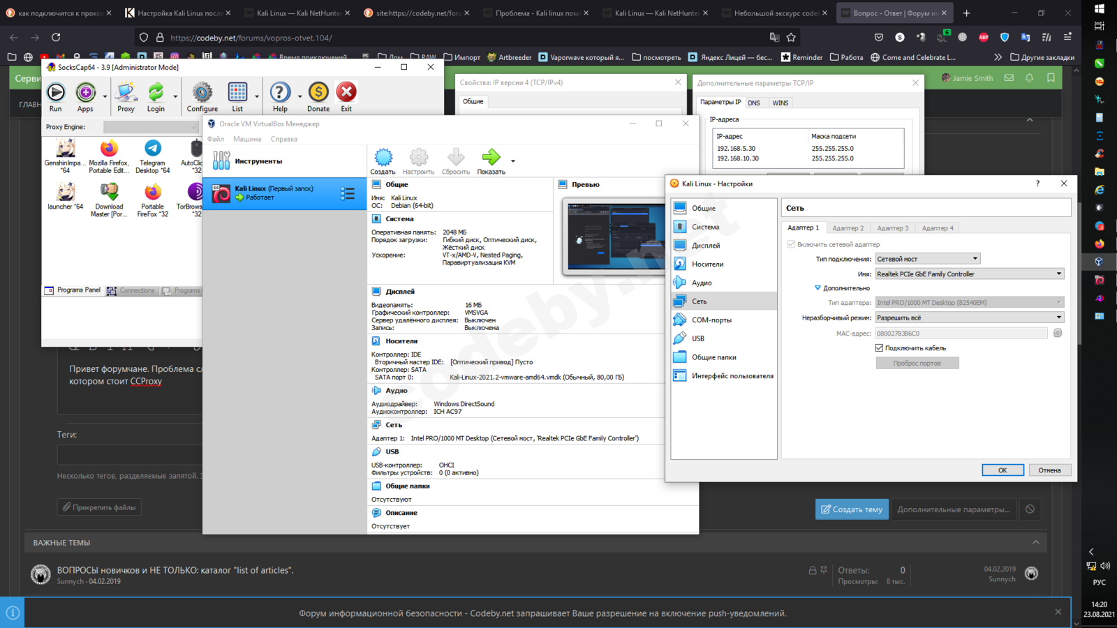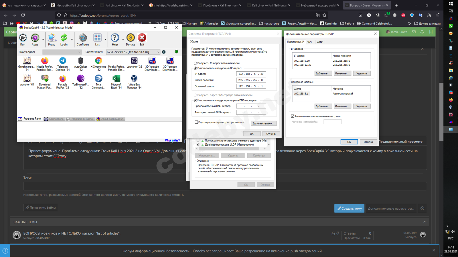 Привет форумчане. Проблема следующая: Стоит Kali Linux 2021.2 на Oracle VM. Домашняя система Windows 10. Изначально подключение к инету реализовано через SocsCap64 3.9 который подключается к компу в локальной сети на котором стоит CCProxy и который собственно имеет доступ к интернету. Третий день ищу инфу как это все реализовать (превентивно отвечаю - в Linux'e совершенно новичок), но ничего найти не могу. Помогите пожалуйста.